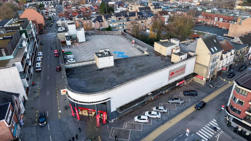 Tectum Group constructed Tectum Group sustainable and low-maintenance roof structure for the Carrefour Market rooftop parking lot in Mol. A two-layer bituminous waterproofing system was chosen for this project, a system that has proven itself in our projects for many years. A thick drainage mat was placed on top of this, finished with gravel and concrete pavers as the final top layer.