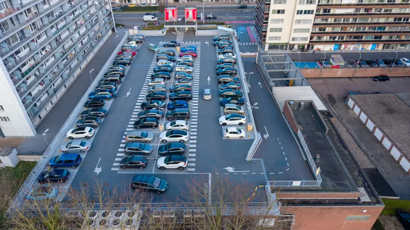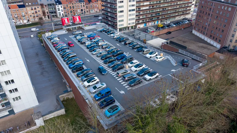 A PMMA system (liquid waterproofing) was chosen for the parking roof of Delhaize in Heverlee, a solution that is particularly suitable for complex details, intensive use, and a completely seamless finish. Because liquid waterproofing is applied directly to the concrete, a concrete base floor is necessary. This results in a heavier and generally slightly more expensive roof structure, but at the same time delivers an extremely stable and durable result. This roof was built 10 years ago and recently received a new colored top coat.
