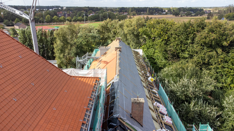 After the renovation of the first building, phase 2 will follow, in which the roof of the main building will be renewed. Here, the existing roofing of 1,500 m² will be removed and replaced with a sarking roof, finished with new slates.